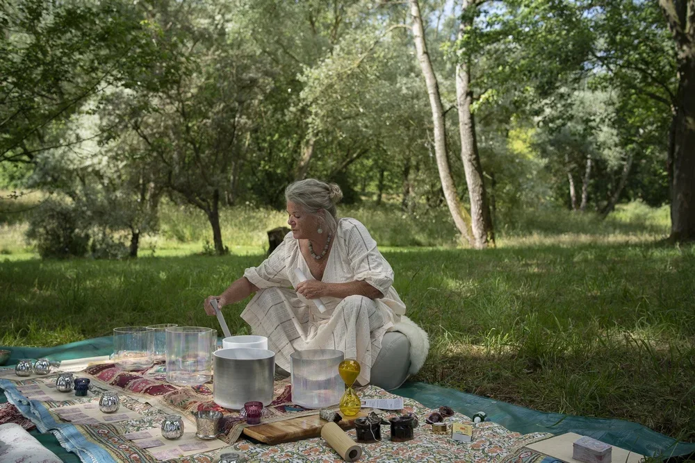 An older woman sitting cross-legged on a blanket in a forest clearing, playing crystal singing bowls amidst various small objects and an hourglass.