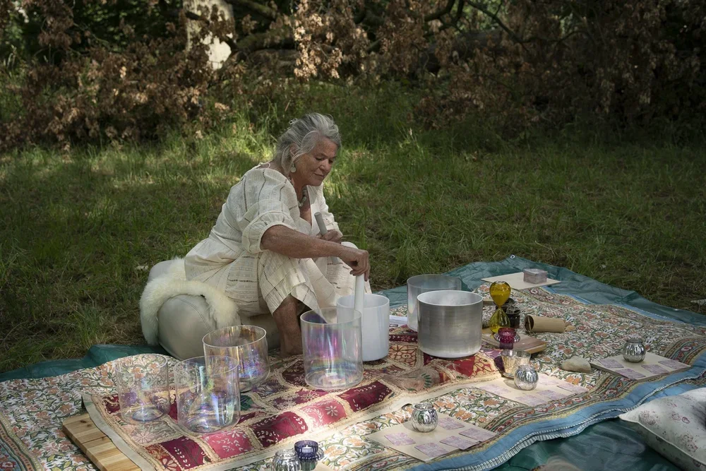 Older woman in sunglasses and white dress sitting on a blanket with singing bowls and decorative items in a lush, green forest.