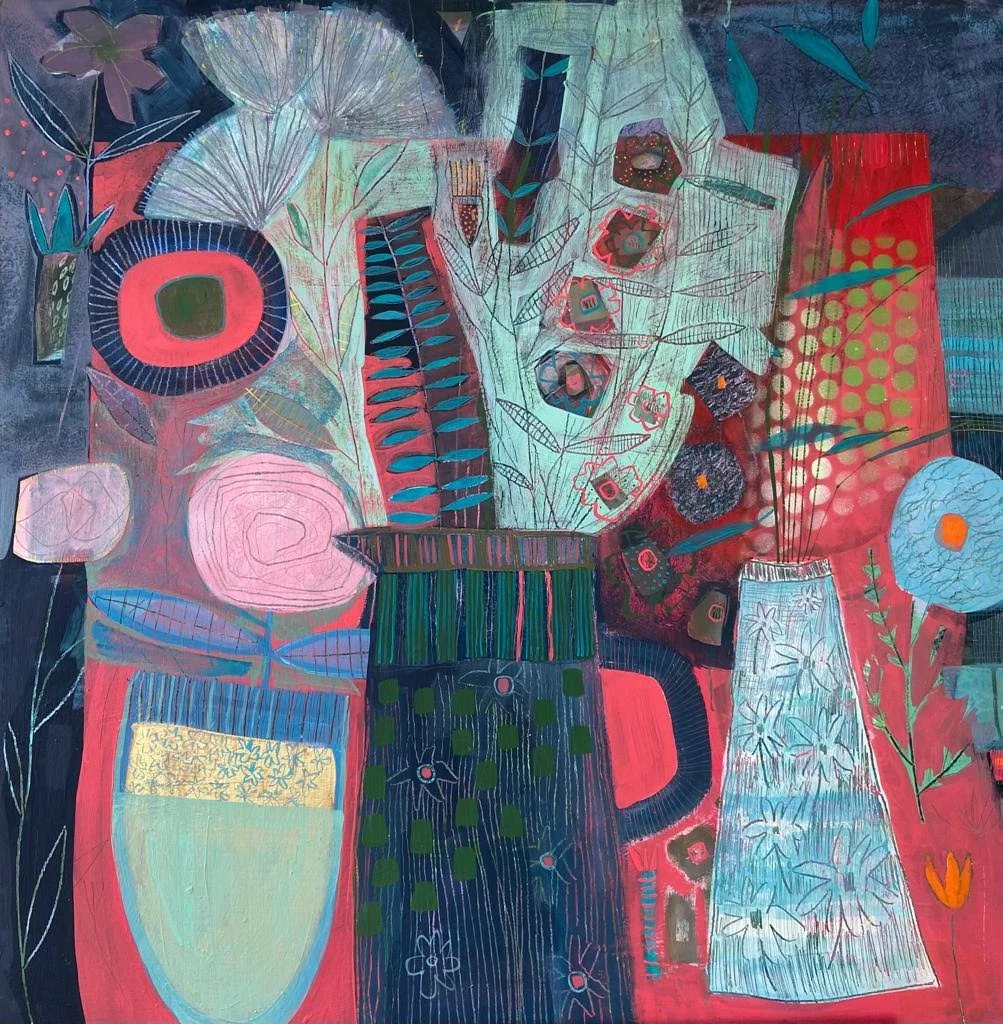 This imbibing of how a landscape ‘feels is perfect preparation for my Abstract Florals where all those feelings come out. Here I work entirely from my imagination which provides a wonderful release from the more closely observed discipline of my landscapes. I realise that, my love of nature and the hours spent observing landscape, comes out in my abstract floral paintings. This could be seen as a sort of cross fertilisation.