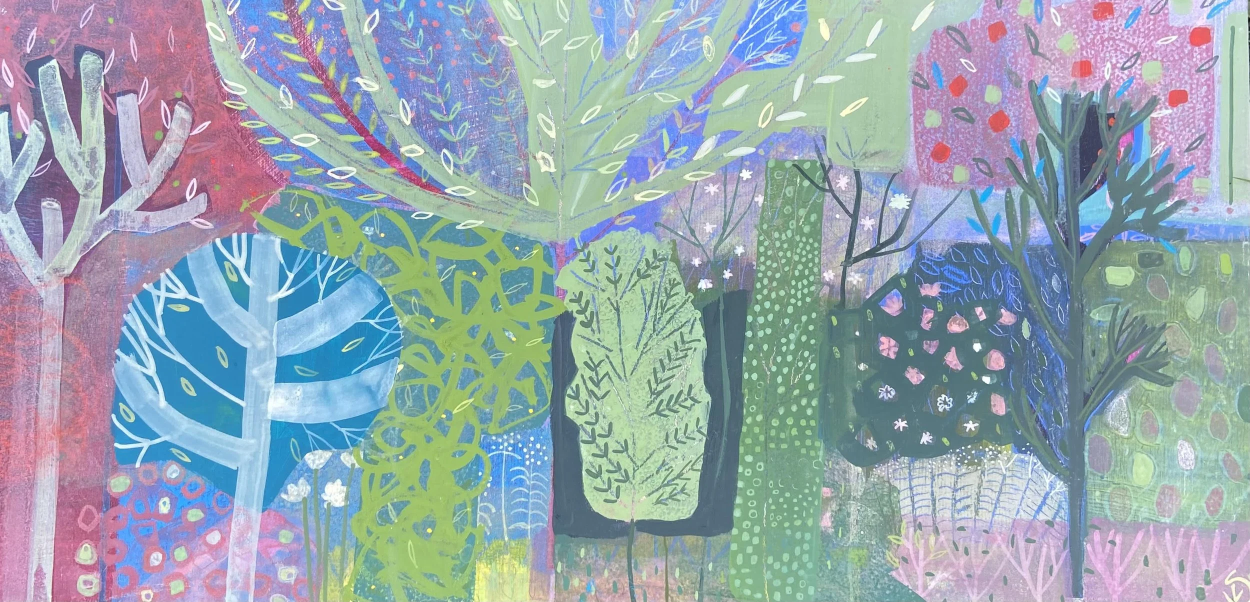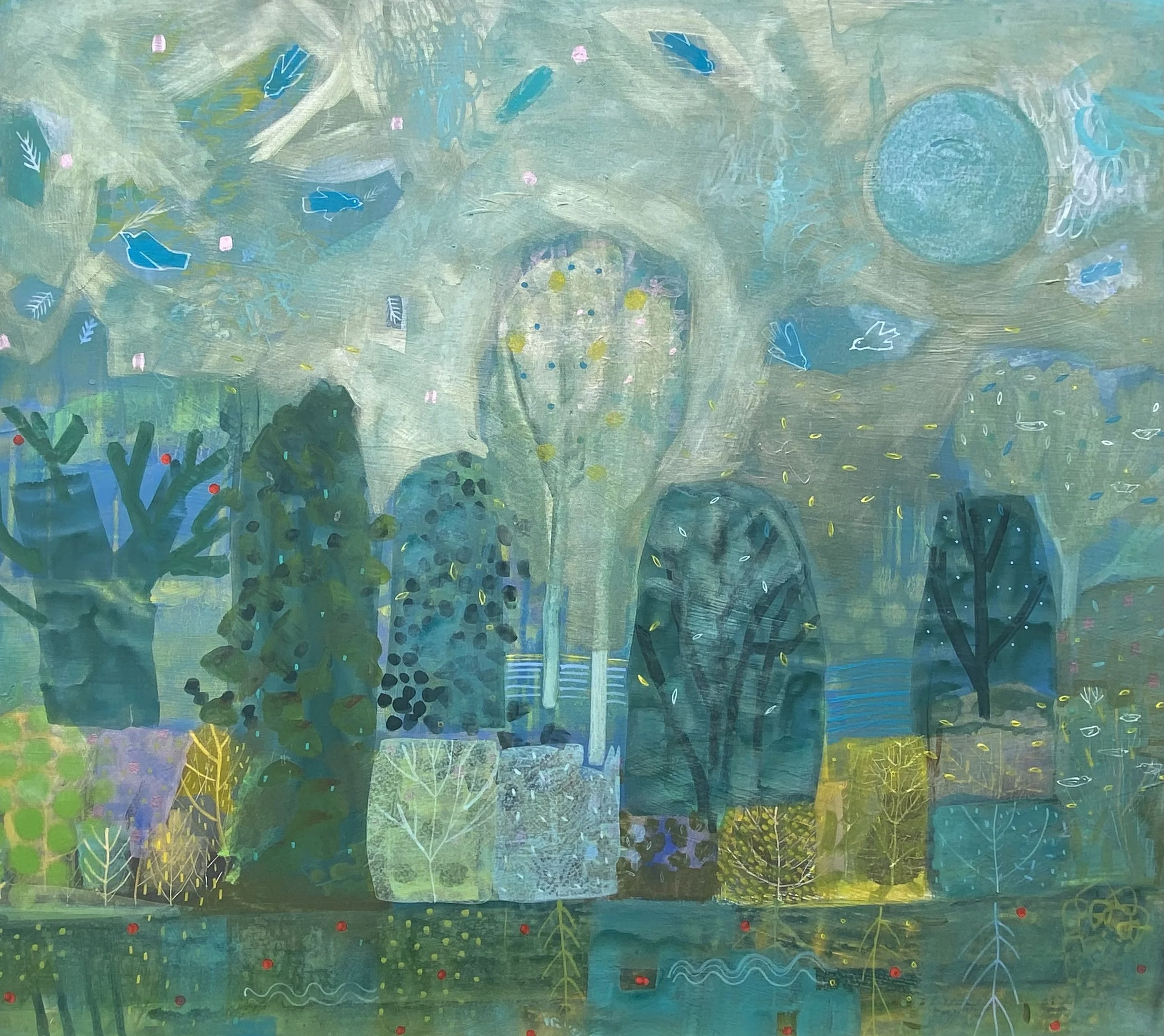 My new paintings for 2023 seem like something of a landmark, a rebirth. Some of them are brand new and others were begun several years before. It is only recently that I have had the time and mental space to bring them to fruition. They are all a celebration of the natural world and the solace it brings. The world of trees and plants, sun, moon, river and sea are the gifts that keep on giving. At times they are the greatest comfort available. It is difficult not to see nature as a set of individual deities, as gods in their own right. Nothing built with such exquisite perfection could have happened by accident. Recent work follows the tradition of paintings before. New paintings such as ‘Tales of the Riverbank’, ‘The Holme Tree’ ‘Enchanted Garden’ and ‘Walk Towards Ravenscar’ all celebrate and pay homage to the restorative power of the natural world. In the cycle of nature is all our lives, the inner states, the outer changes, the constant endings and beginnings, the deaths and rebirths.