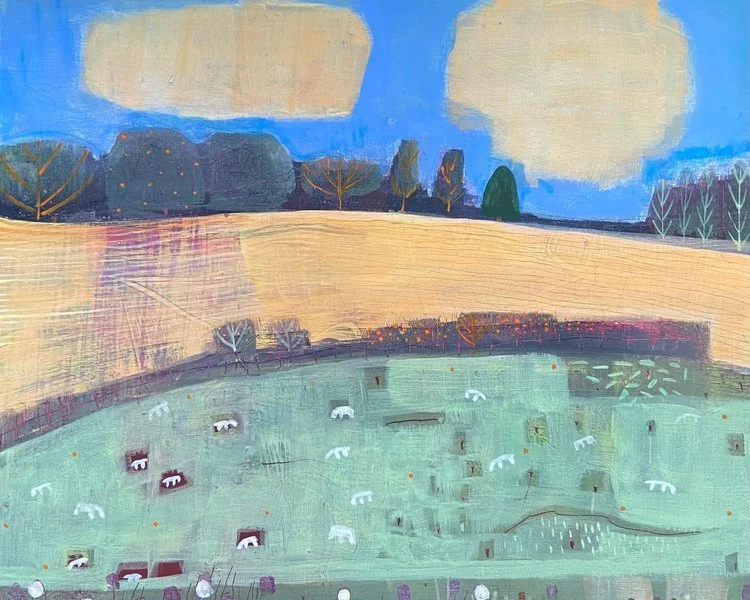 After initial painting outside, the work is brought back to the studio to develop. It is here that I begin to create ‘a version’ of what I originally observed. Becoming consumed with colour and surface and letting the painting intuitively lead me, I take risks with colour and form, always seeking something fresh and unexpected. I have never forgotten a student saying to me on a painting course “you’re just making things up”. She illuminated for me the essence of my practice. All my landscapes have their beginnings in observation, and then they take on a life of their own.