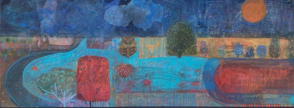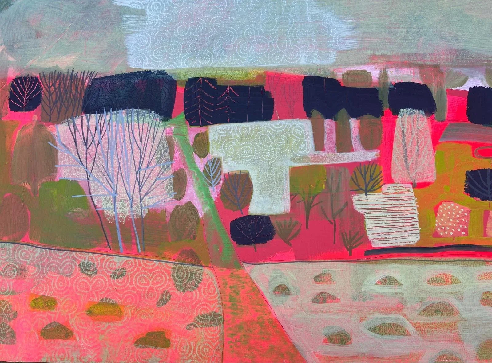 After initial painting outside, the work is brought back to the studio to develop. It is here that I begin to create ‘a version’ of what I originally observed. Becoming consumed with colour and surface and letting the painting intuitively lead me, I take risks with colour and form, always seeking something fresh and unexpected. I have never forgotten a student saying to me on a painting course “you’re just making things up”. She illuminated for me the essence of my practice. All my landscapes have their beginnings in observation, and then they take on a life of their own.