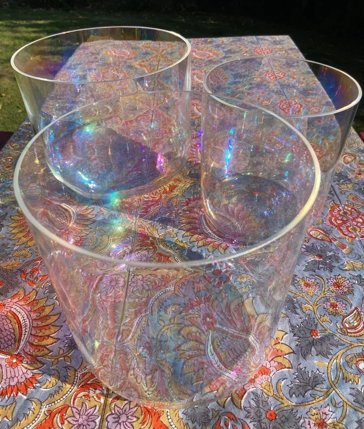 The Alchemy Crystal Bowls I use not only produce a deep, fundamental tone, but also higher-frequency overtones known as harmonics — creating their uniquely soothing sound. Their vibrations can be felt throughout the body, helping to encourage relaxation, reduce stress, and even ease pain. Each bowl has been carefully chosen for its distinct healing properties.